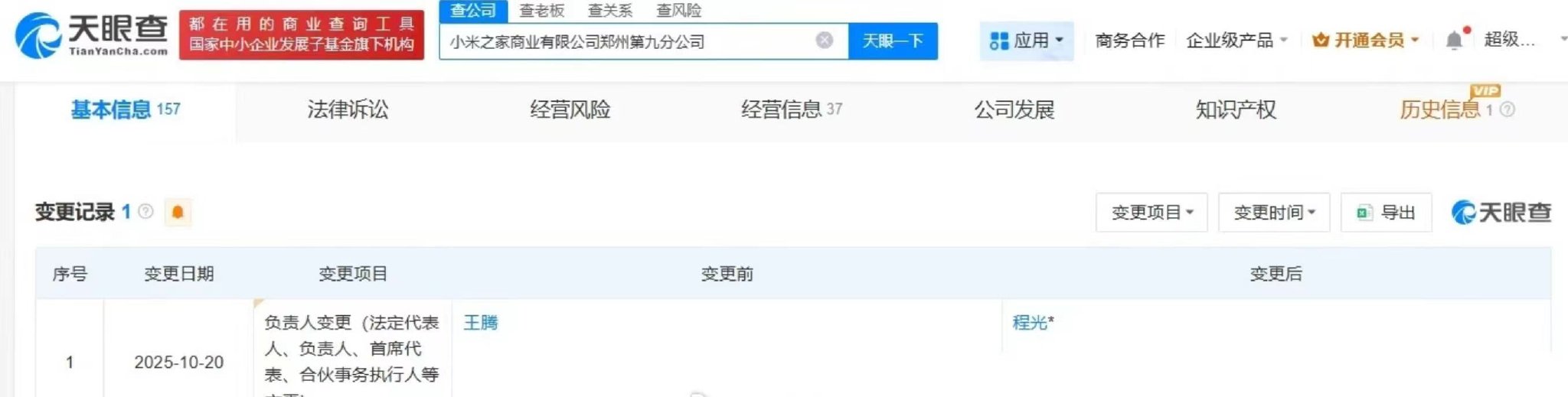 10月20日八戒策略,天眼查APP显示,小米之家商业有限公司郑州第九分公司发生工商变更,王腾卸任该公司负责人,由程光接任,该公司成立于2022年11月。公开资料显示,程光是小米集团河南分公司总经理。
